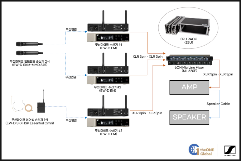 (무선마이크 수신기 3개, 마이크 라인 믹서 1개를 3RU RACK에 장착)